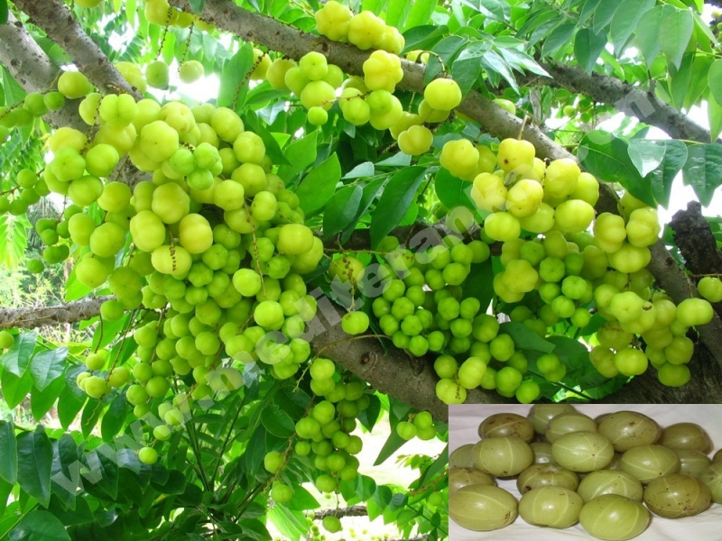 Phyllanthus emblica (Emblica officinalis), the Indian gooseberry, or aamla, is a deciduous tree of the family Phyllanthaceae. It is known for its edible fruit of the same name. The tree is small to medium in size, reaching 8 to 18 m in height, with a crooked trunk and spreading branches, the leaves are simple, subsessile, light green. The flowers are greenish-yellow. The fruit is nearly spherical, light greenish yellow, quite smooth and hard on appearance. Ripening in autumn, the berries are harvested by hand after climbing to upper branches bearing the fruits. The taste of Indian gooseberry is sour, bitter and astringent, and it is quite fibrous. Indian gooseberry has undergone preliminary research, demonstrating in vitro antiviral and antimicrobial properties. There is preliminary evidence in vitro that its extracts induce apoptosis and modify gene expression in osteoclasts involved in rheumatoid arthritis and osteoporosis. It may prove to have potential activity against some cancers.