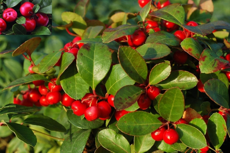 Gaultheria procumbens (eastern teaberry, checkerberry, boxberry, or American wintergreen) is a species of Gaultheria native to northeastern North America. It is a member of the Ericaceae (heath family). It is a small low-growing shrub, typically reaching 10–15 centimeters tall. The leaves are evergreen, elliptic to ovate, 2–5 cm long and 1–2 cm broad, with a distinct oil of wintergreen scent. The flowers are bell-shaped, 5 mm long, white, borne solitary or in short racemes. The berry-like fruit is actually a dry capsule 6–9 mm diameter. It is a calcifuge, favoring acidic soil, in pine or hardwood forests, although it generally produces fruit only in sunnier areas.