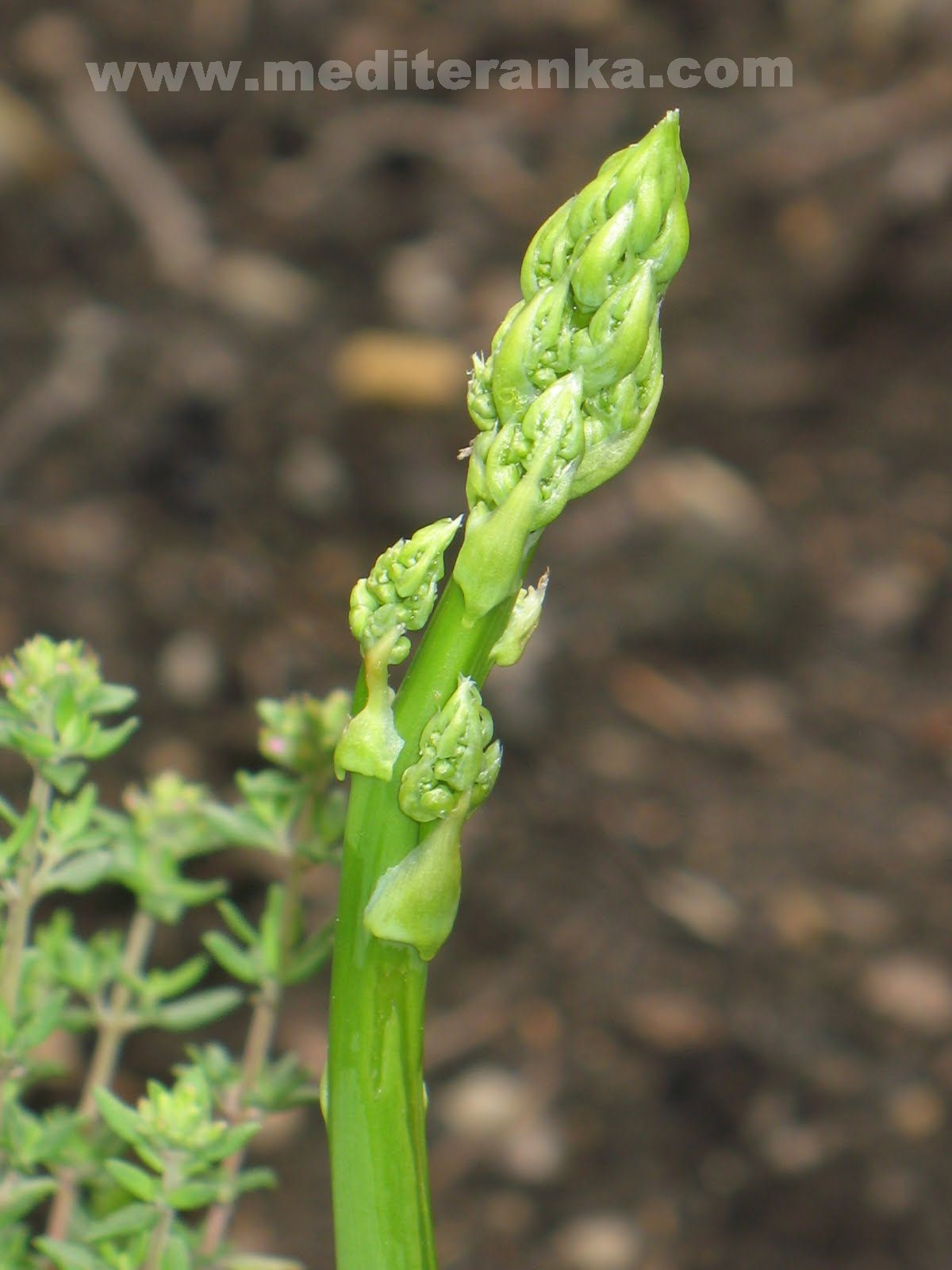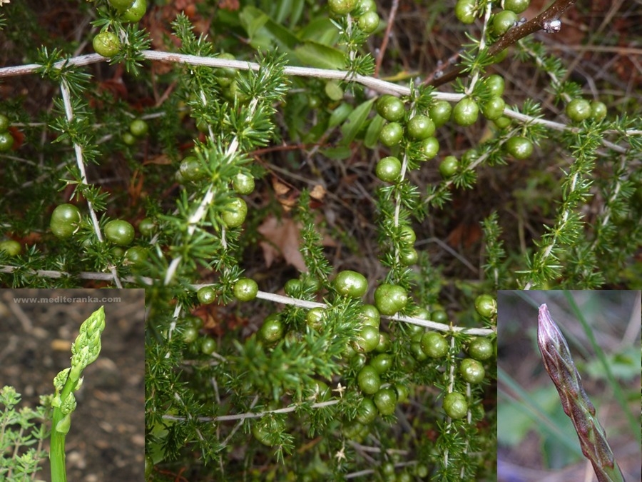 Wild asparagus (Asparagus acutifolius) is an evergreen perennial plant belonging to the genus Asparagus. The Latin name acutifolius of this species, meaning "thorny leaves", derives from the characteristics shape of the leaves, a quite common feature in the typical plants of the Mediterranean. Asparagus acutifolius reaches on average 30–70 centimetres of height. The stems have much-branched feathery foliage. The "leaves" are in fact needle-like modified stems. The flowers are bell-shaped and in small clusters, greenish-white to yellowish, 4–5 millimetres long. The flowers are dioecious (on each plant they are only male or female).