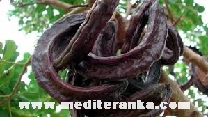 The fruit is a pod that can be elongated, compressed, straight or curved, and thickened at the sutures. The pods take a full year to develop and ripen. The ripe pods eventually fall to the ground and are eaten by various mammals, thereby dispersing the seed. Likewise, carob consumed by humans is actually the dried (and sometimes roasted) pod.