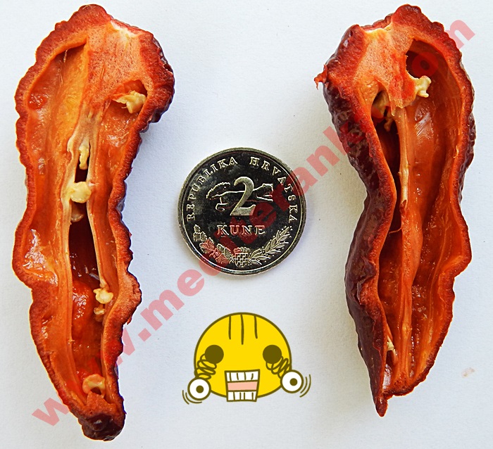However, as of 2012, it was superseded by the Trinidad moruga scorpion. On December, 2013, the Guinness World Records rated the Carolina Reaper the world's hottest pepper, moving the ghost chili to third place. Ripe peppers measure 60 to 85 mm long and 25 to 30 mm wide with a red, yellow, orange, or chocolate color. Bhut jolokia pods are unique among peppers, with their characteristic shape, and very thin skin.