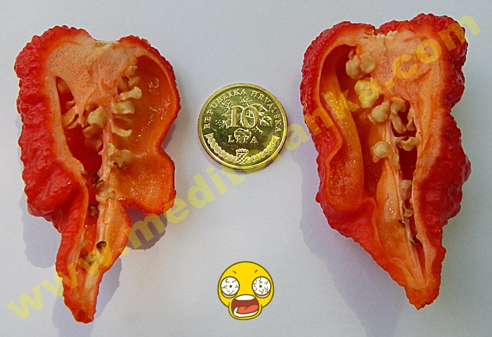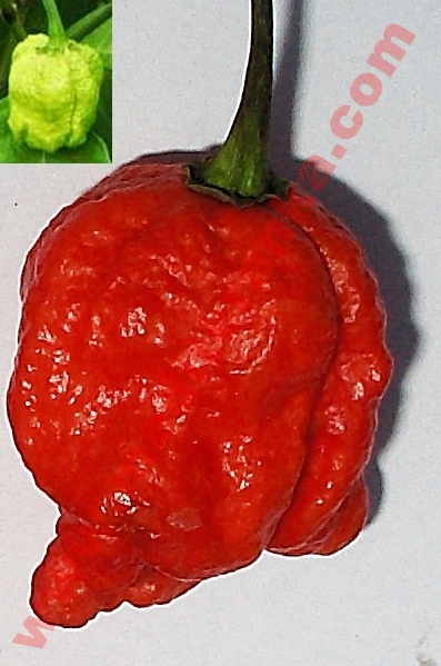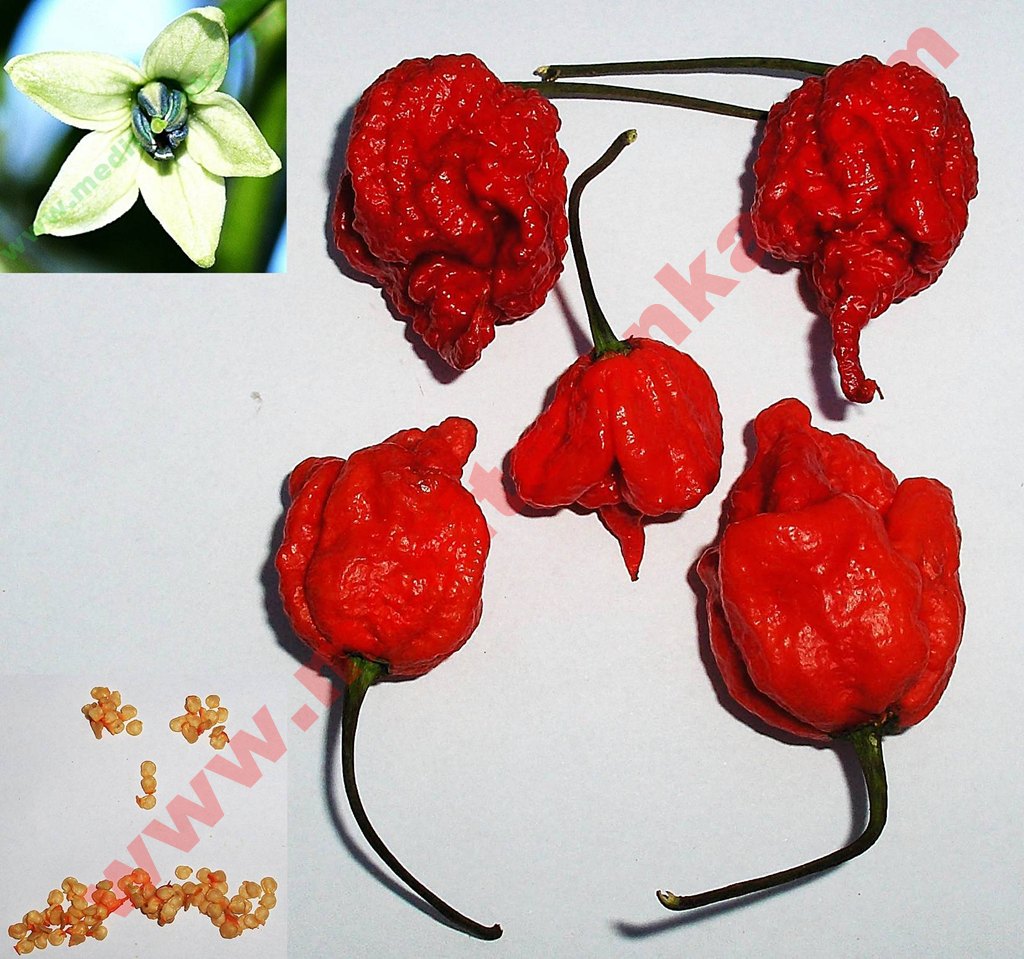 The Carolina Reaper is a hybrid cultivar of chili pepper of the Capsicum chinense species, it's the world's hottest hybrid pepper. The original cross was a red naga pepper (see offer) and a Red Savina pepper (see offer). The Carolina Reaper was rated as the world's hottest chili pepper by Guinness World Records according to 2012 tests, averaging 1,569,300 on the Scoville scale with peak levels of over 2,200,000 Scoville Heat Units (SHU). The previous record-holder was the Trinidad Scorpion Butch T.
