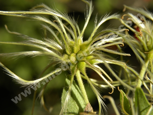 Clematis flammula is a deciduous climber growing to 4 m. It is in leaf in March, in flower from August to October, and the seeds ripen from October to January. The flowers are hermaphrodite (have both male and female organs) and are pollinated by bees, flies. It is suitable for light, medium and heavy soils and prefers well-drained soil. It can grow in semi-shade (light woodland) or no shade. It prefers moist soil. The plant can tolerate strong winds but not maritime exposure. Plants are hardy to about -15°C. The leafstalks wrap themselves around twigs and branches for support. When a side of the stalk touches an object, the growth on that side slows down whilst the other side grows at its normal rate - this causes the leaf stalk to entwine the object it is touching. When planting out, in order to avoid the disease 'clematis wilt', it is best to plant the rootball about 8 cm deeper in the soil. This will also serve to build up a good root crown of growth buds.