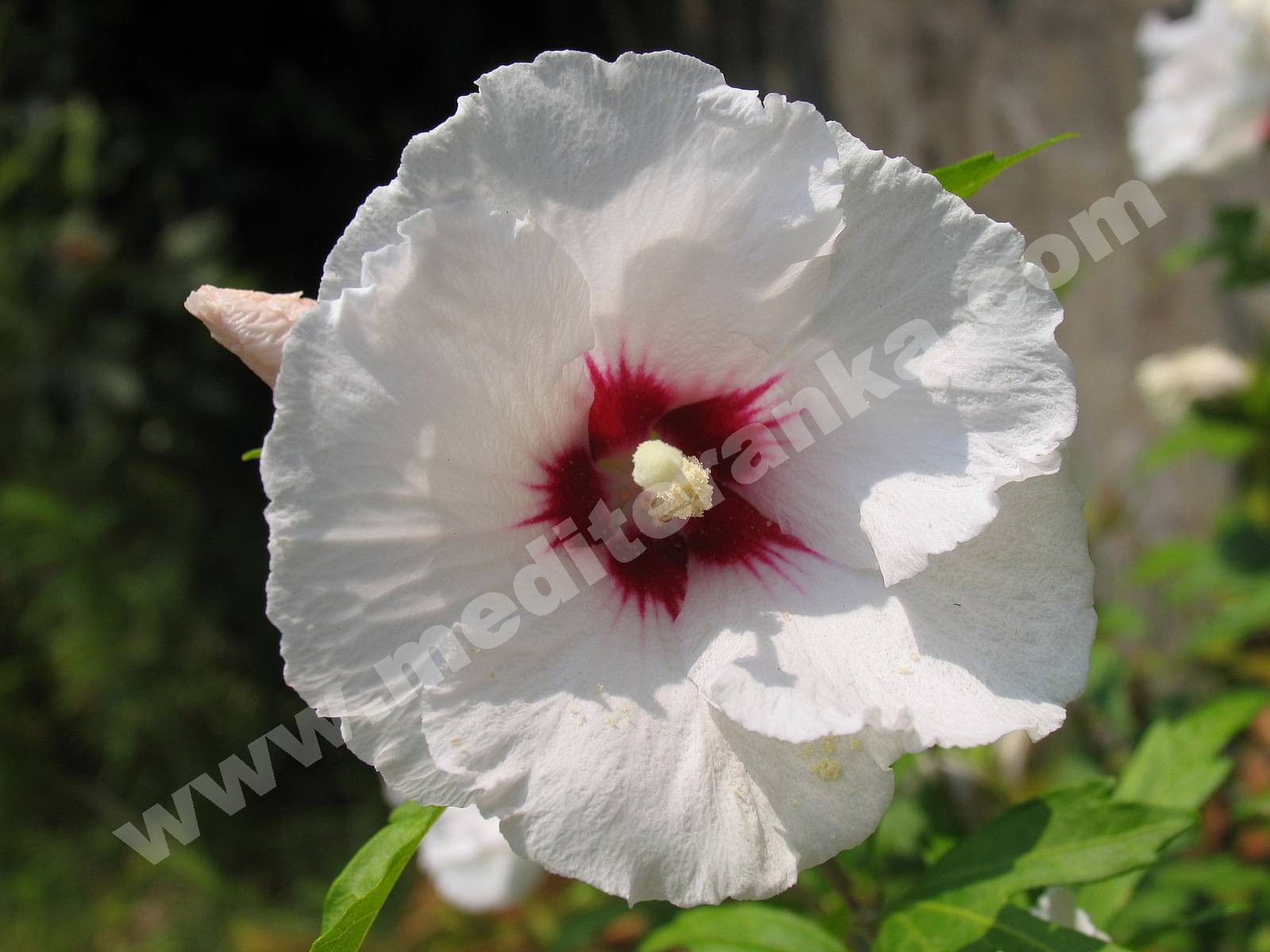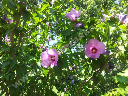 H. syriacus is a hardy deciduous shrub. It is upright and vase-shaped, reaching 2–4 m height, bearing large trumpet-shaped dark pink flowers with prominent yellow-tipped white stamens. Individual flowers are short-lived, lasting only a day. However, numerous buds are produced on the shrub's new growth, which provides prolific flowering over a long summer blooming period. Shoots make interesting indoor vase cuttings, as they stay green for a long time. In the vase some new flowers may open from the more mature buds. The species has naturalized very well in many suburban areas, and might even be termed slightly invasive, so frequently does it seed around.