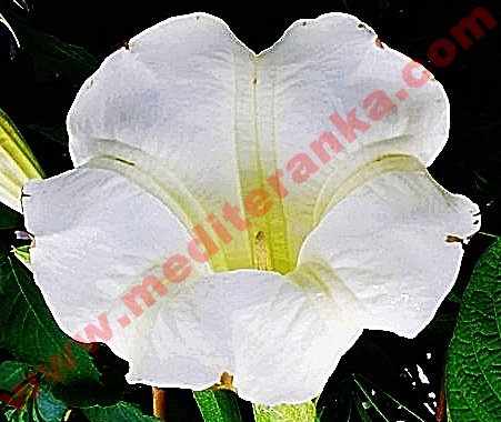 Datura inoxia (thorn-apple, downy thorn-apple, Indian-apple, lovache,moonflower, sacred datura, nacazcul, toloatzin, tolguache or toloache) is a species in the family Solanaceae. Datura inoxia is an annual shrubby plant that typically reaches a height of 0.6 to 1.5 metres. Its stems and leaves are covered with short and soft grayish hairs, giving the whole plant a grayish appearance. All parts of the plant emit a foul odor similar to rancid peanut butter when crushed or bruised, although most people find the fragrance of the flowers to be quite pleasant when they bloom at night. The flowers are white, trumpet-shaped, 12–19 cm long. They first grow upright, and later incline downward. It flowers from early summer until late fall. The fruit is an egg-shaped spiny capsule, about 5 cm in diameter. It splits open when ripe, dispersing the seeds.