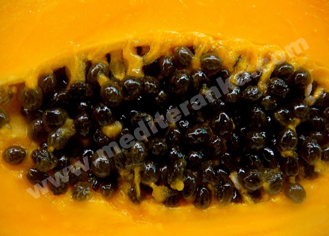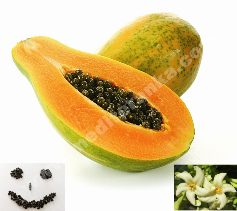 The papaya, papaw, or pawpaw is the fruit of the plant Carica papaya, the sole species in the genus Carica of the plant family Caricaceae. It is native to southern Mexico. The papaya is a large, tree-like plant, with a single stem growing from 5 to 10 m tall, with spirally arranged leaves confined to the top of the trunk. The leaves are large, 50–70 cm in diameter, deeply palmately lobed, with seven lobes. The flowers appear on the axils of the leaves, maturing into large fruit, 15–45 cm long and 10–30 cm in diameter. The fruit is ripe when it feels soft and its skin has attained an amber to orange hue. In some parts of the world, papaya leaves are made into tea as a treatment for malaria.