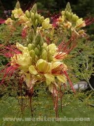 It is a striking ornamental plant native to tropical America, mainly Argentina and Uruguay. It is naturalised in Texas, and fairly common in the rest of the southwestern United States, where it is known as bird of paradise bush, desert bird of paradise, yellow bird of paradise, and barba de chivo.