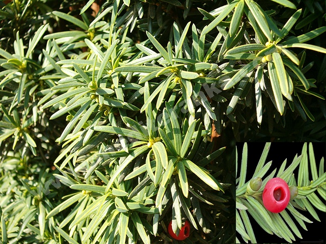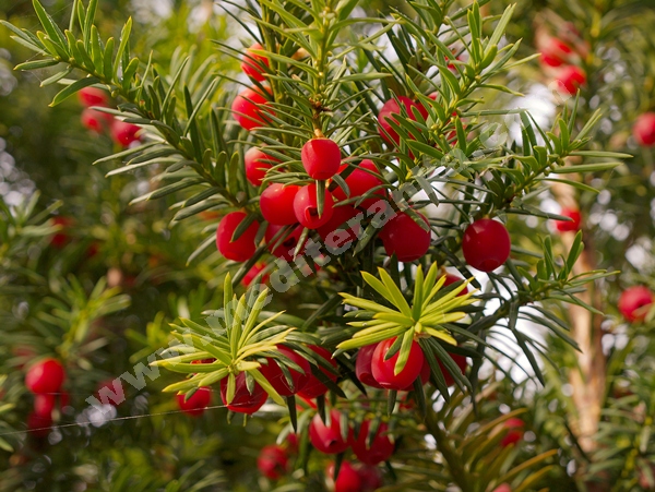 Taxus baccata, Jew tree is a small- to medium-sized evergreen tree, growing 10–20 metres tall, with a trunk up to 2 metres diameter. The leaves are lanceolate, flat, dark green, 1–4 centimetres long and 2–3 millimetres broad, the leaves are highly poisonous.