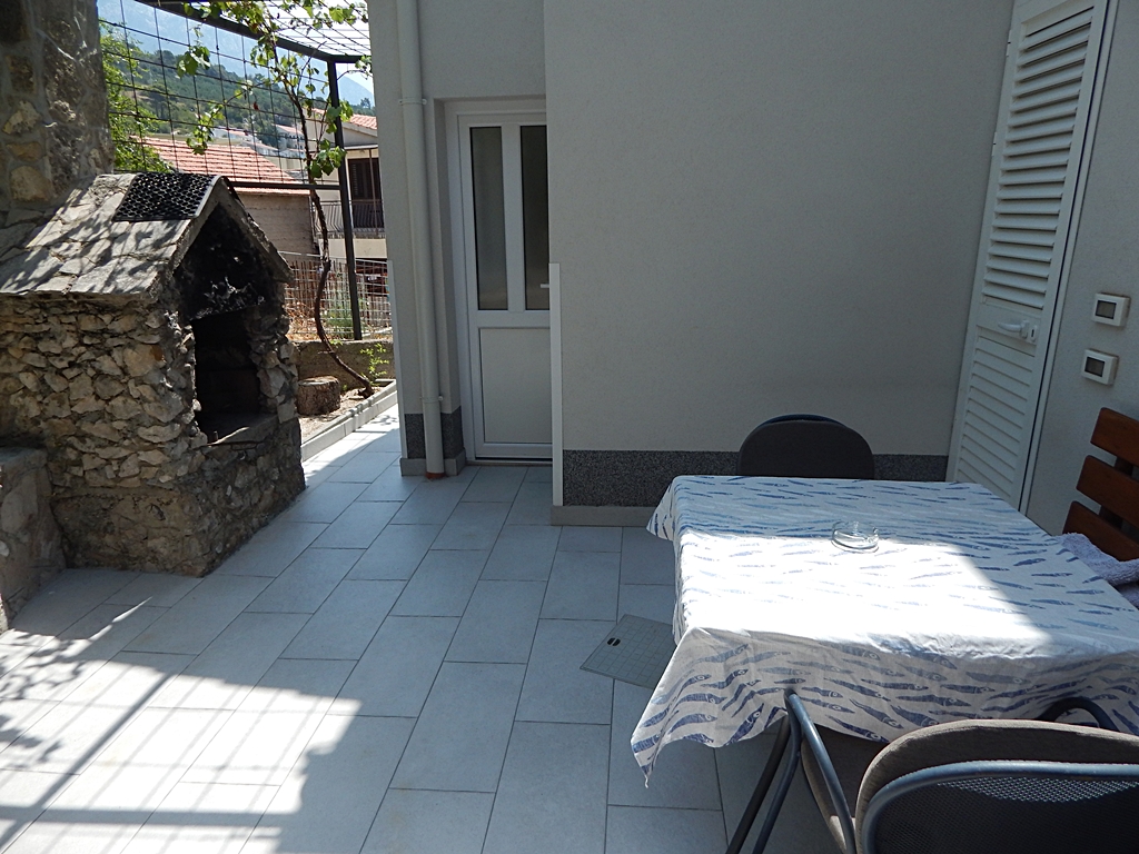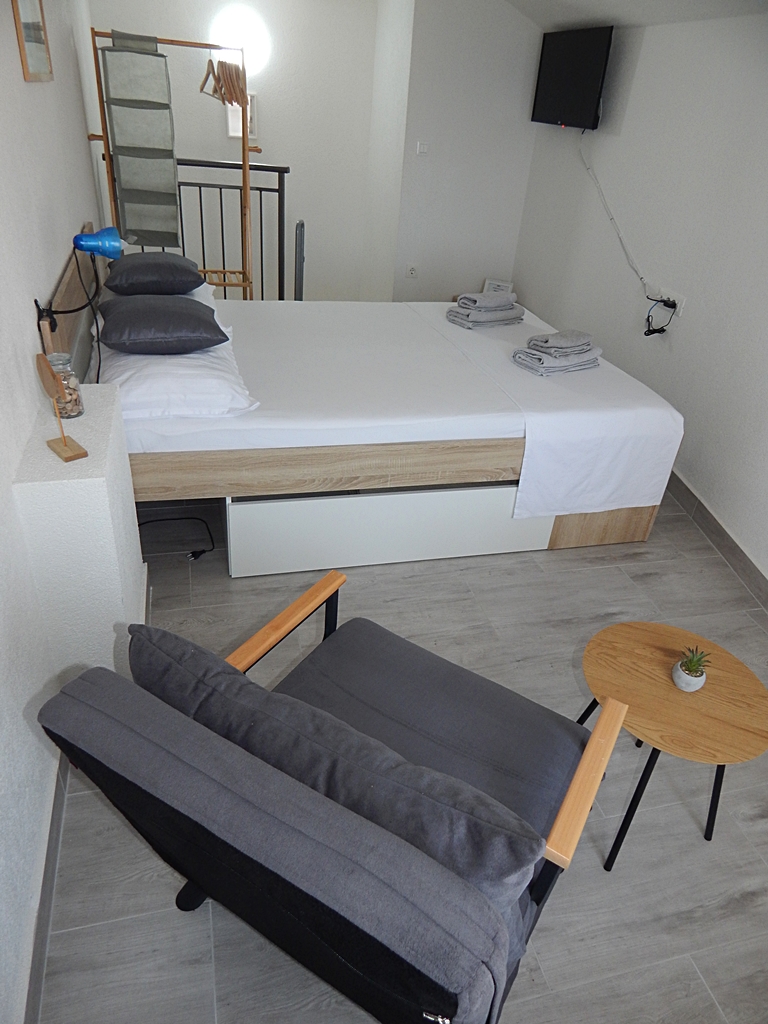Dvoetažni je, na katu je soba s bračnim krevetom i pogledom na more, dole je WC, tuš, kuhinja. Ispred apartmana je velika terasa s roštiljem.