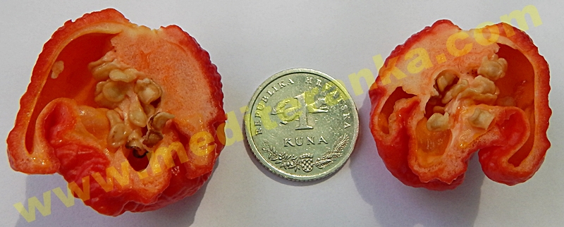 Odrasla biljka je prosječne visine oko 80 cm, zreo plod je dužine oko 4 cm a također toliko i širok, crvene je boje. Pogodna je za sušenje i mljevenje, često se koristi za pripremu raznih ekstremno ljutih chili umaka.