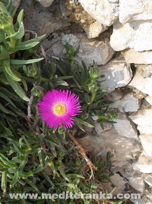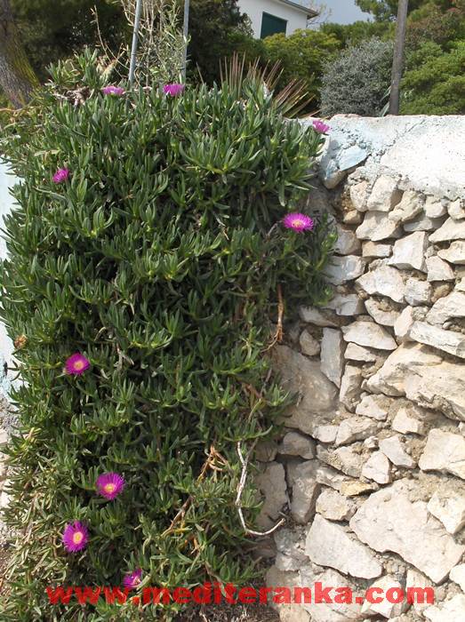 Drugi i kod nas najčešći je Carpobrotus acinaciformis, koji ima tamnije roza-lila cvjetove i posve glatko-ravne bridove lista (nisu nazubljeni). Taj prirodno raste u slanim polupustinjama i uz more, a voli alkalno-bazična i slana tla i izvrsno podnosi vapnenački kameni krš. Uz stalno obilje soli (kao antifriz) prezimi do desetak ispod nule, ali bez soli promrzne već na -5C do -6C. Zato je ovaj često sađen i obilno podivljao na morskim obalama uz cijeli Jadran od Istre do Bara, ali već u bližem zaleđu bez soli - unutarnjoj Istri i dalmatinskoj Zagori i Hercegovini obično promrzne.