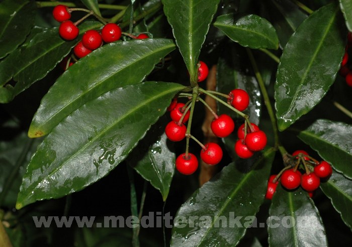 Za sobne uvjete pogodna je Ardisia crenata, čije je prirodno stanište od Japana pa sve do otoka Tihog mora. U Floridi su je proglasili invanzivnom biljkom zato sto se vrlo lako razmnožava iz sjemena. Listovi su nasuprotni, zimzeleni, kožasti. Cvijet je ružičaste i bijele boje. Glavni ukras su okrugle, skoro kao grašak velike, koraljno-crvene bobice. Za ovu biljku je značajna osobina rađanja "živih mladih" (viviparija), jer neposredno iz plodova na biljci izbijaju klice. To je vrlo lijepa kućna biljka, ne samo zbog dekorativnih bobica, već je zanimljiva i zbog viviparije.