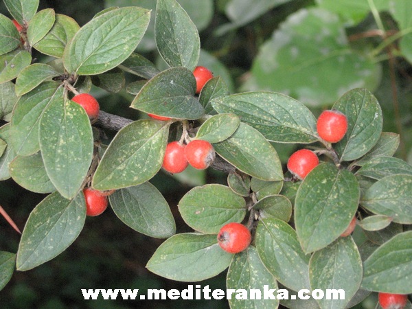 Cotoneaster horizontalis - poluzimzelena vrsta, tamnozelenih sjajnih listića koji do kasne jeseni ostaju na granama prekrasnih jesenskih boja,.Lepezasto raširenih grana, s bijelim ili blijedoružičastim cvjetićima u svibnju i bogatstvu crvenih bobica tijekom jeseni. Naraste do 80 cm visoko, a puzajuće grane dosegnu dva metra dužine, pa se često sadi kao prekrivač strmih dijelova vrta.